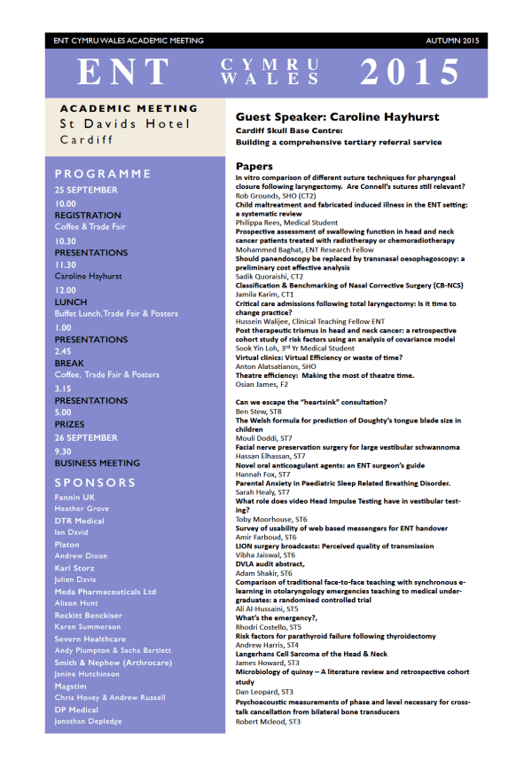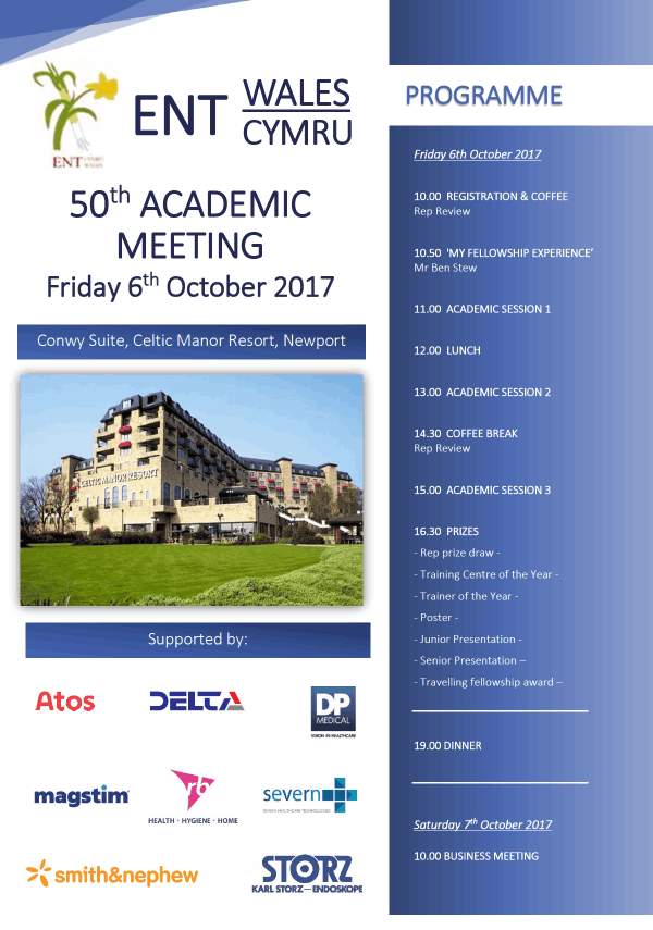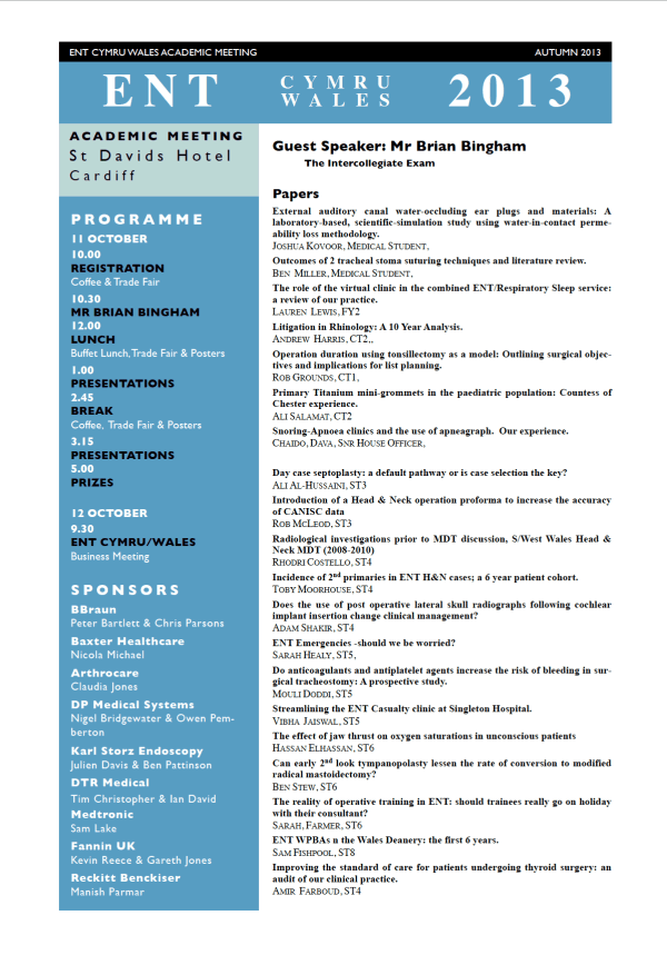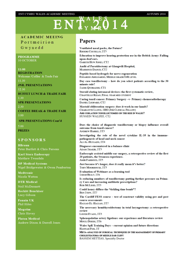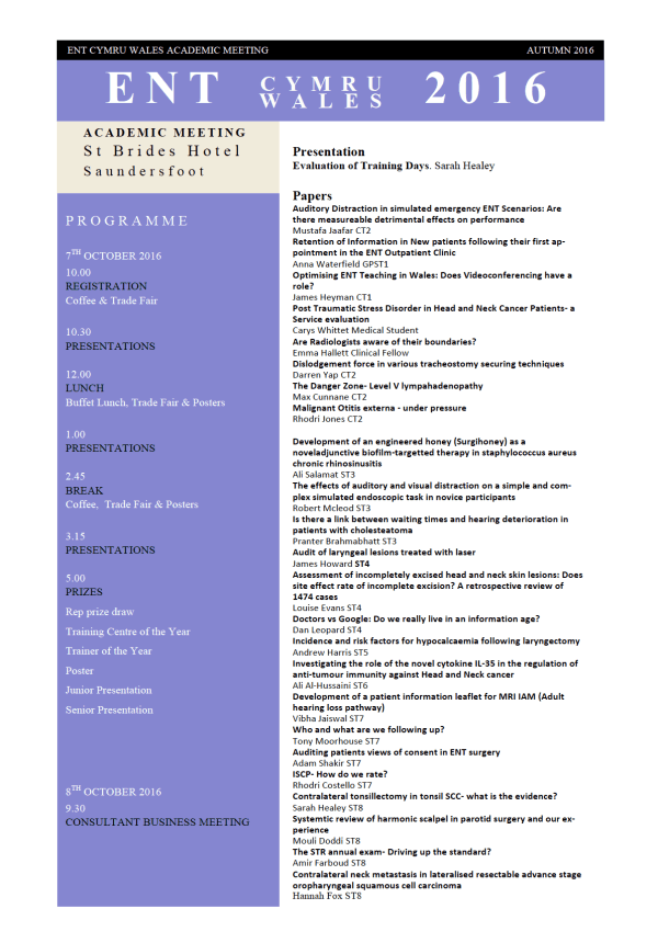 Every October a conference is held in North, South or West Wales for Welsh trainees to present their research work to the Consultant body. An evening dinner follows.